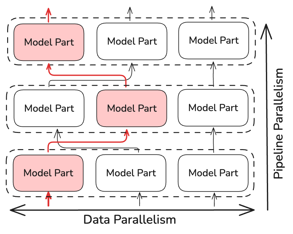 मानक डेटा-समानांतर प्रशिक्षण (standard data-parallel training) में, प्रत्येक वर्कर अपने स्वयं के मिनी-बैच पर ग्रेडिएंट्स की गणना करता है और फिर एक क्लस्टर-व्यापी ऑल-रिड्यूस (all-reduce) में भाग लेता है ताकि प्रत्येक प्रतिकृति (replica) एक ही अपडेट देख सके। सामूहिक संचार (collective communication) प्रतिकृति की संख्या के साथ रैखिक रूप से बढ़ता है और सबसे धीमी लिंक (slowest link) द्वारा सीमित होता है। इंटरनेट से जुड़े नोड्स पर, यह चरण वॉल टाइम (wall time) पर हावी होता है और कम्प्यूट संसाधनों की बर्बादी करता है। डीलोको (DiLoCo) जैसी कम-संचार योजनाएं ऑल-रिड्यूस की आवृत्ति को कम करती हैं, लेकिन प्रत्येक सिंक्रनाइज़ेशन में अभी भी हर वर्कर शामिल होता है और इसलिए यह समान विलंब सीमा (latency bound) को विरासत में लेता है।