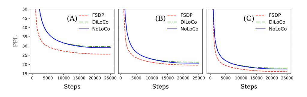 NoLoCo는 all-reduce 동기화를 피하면서도 수렴 속도를 저하시키지 않음을 보여줍니다.